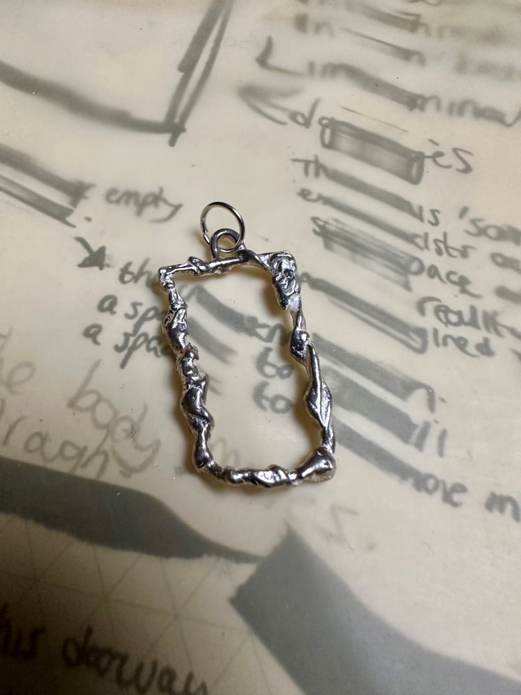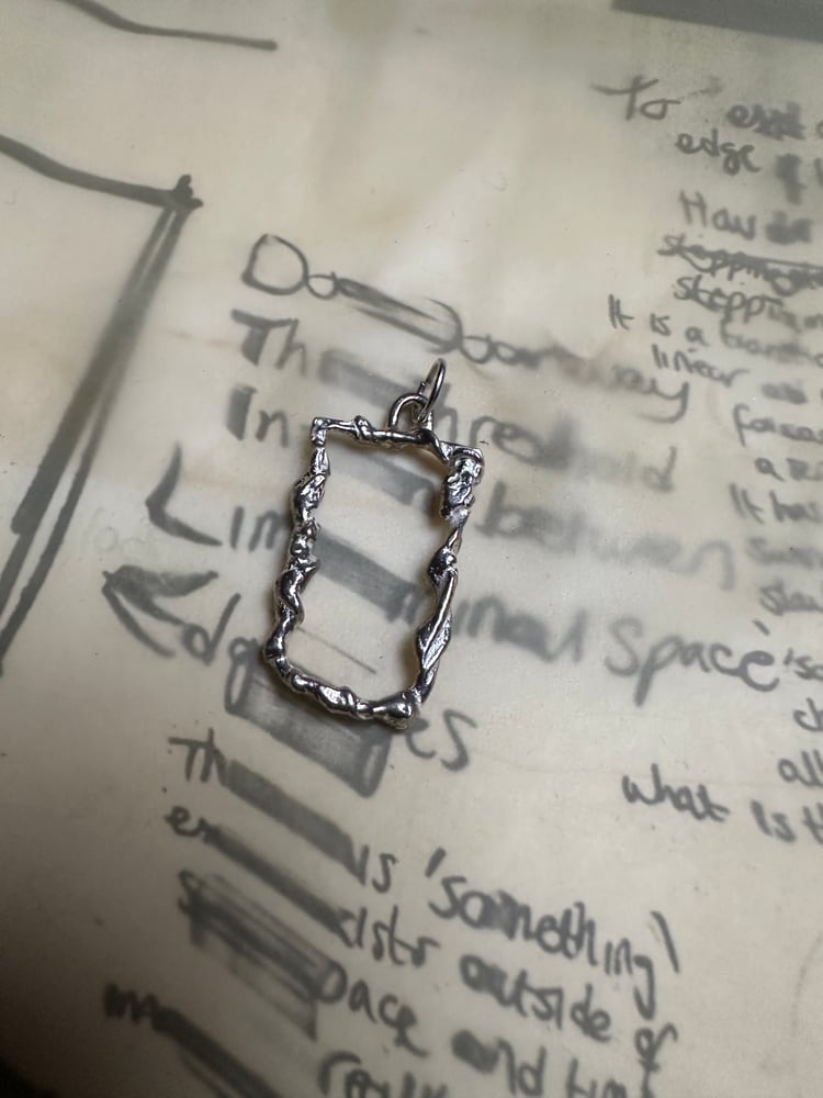 Molten silver charm echoing the shape of a doorway. It speaks to thresholds, portals, and liminal spaces. A symbol of transition, the possibilities beyond and the in-between places we inhabit.