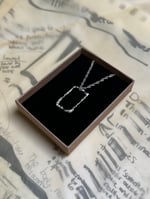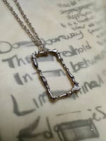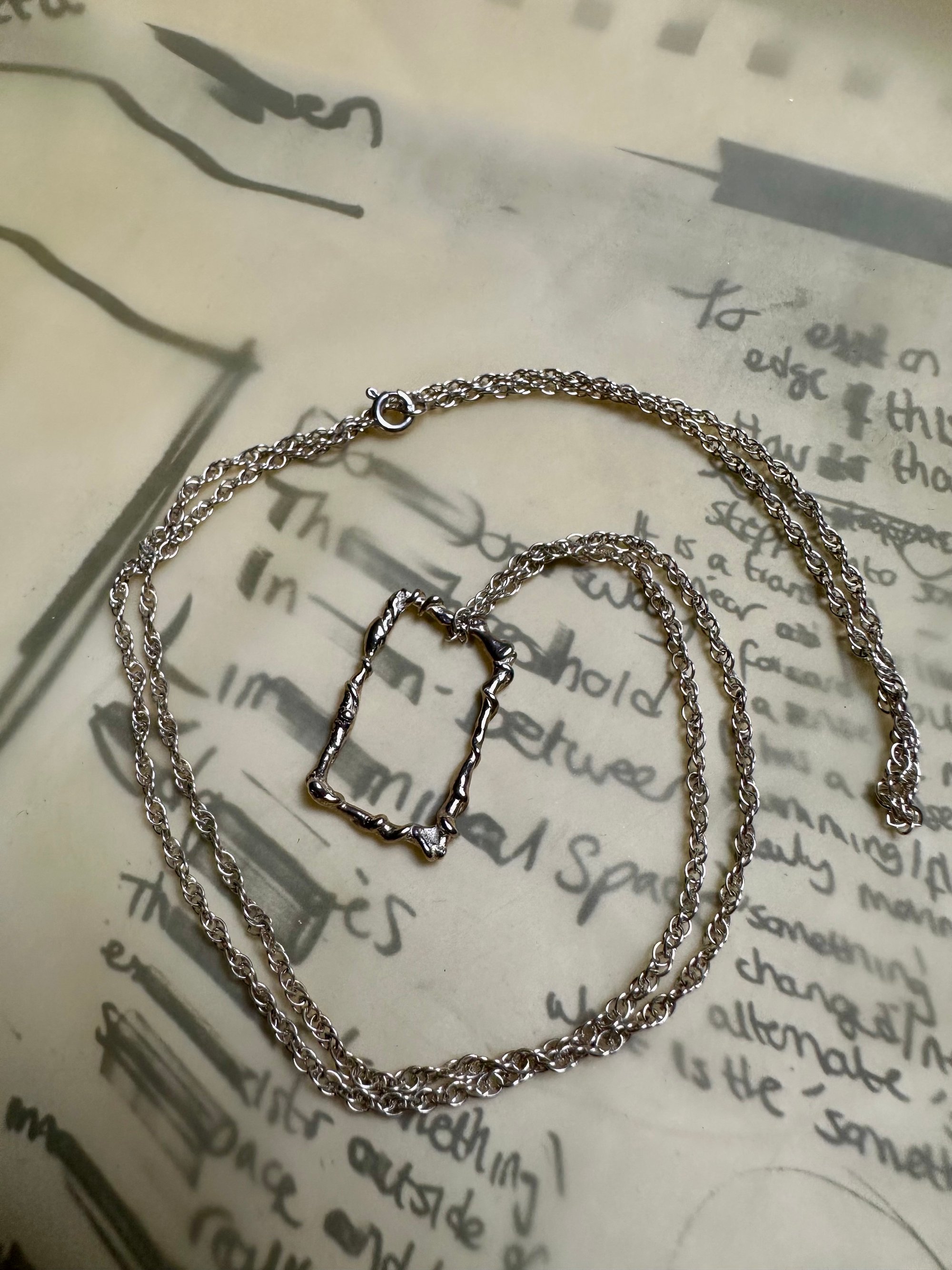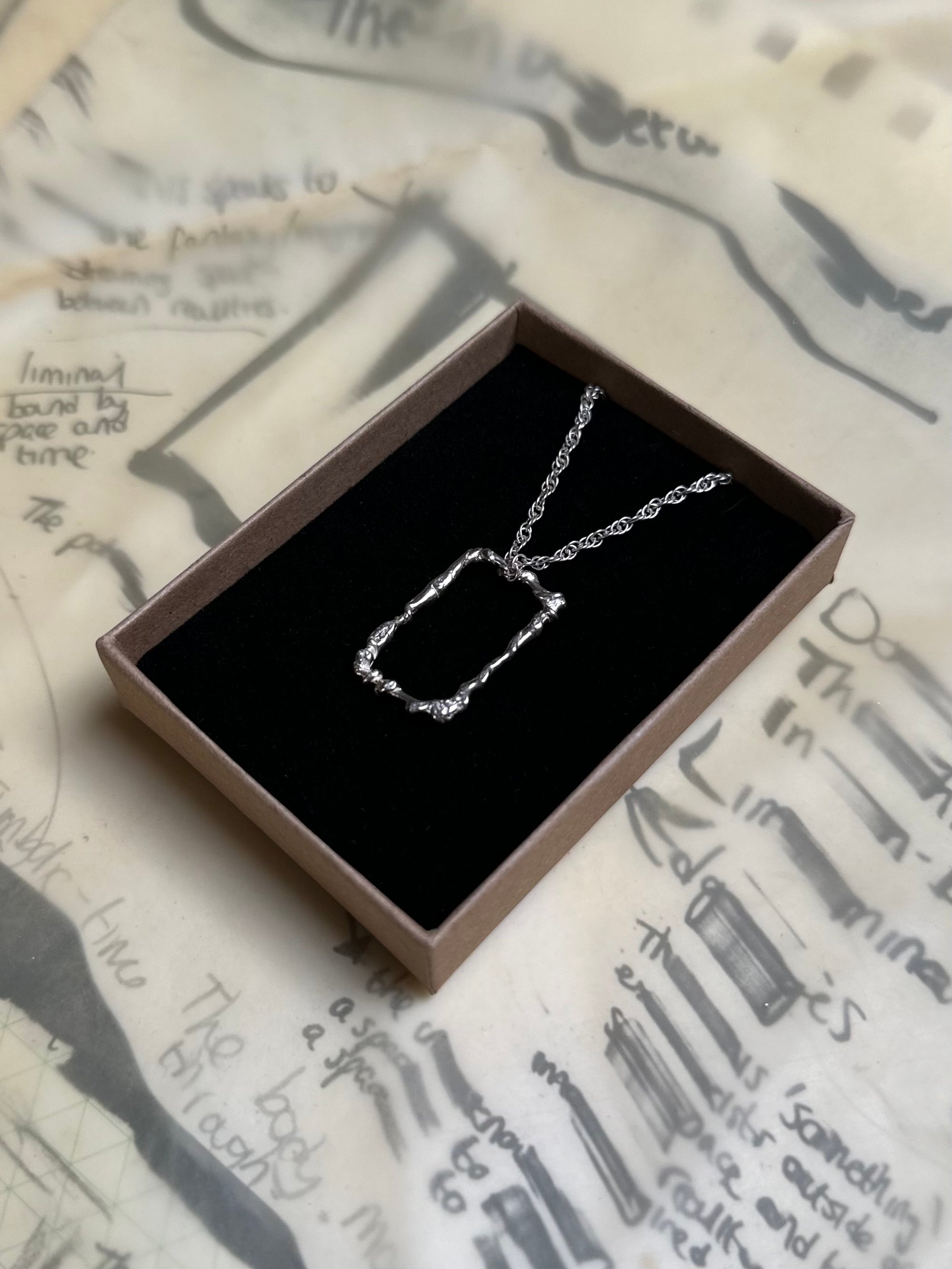 Molten silver pendant echoing the shape of a doorway. It speaks to thresholds, portals, and liminal spaces. A symbol of transition, the possibilities beyond and the in-between places we inhabit.