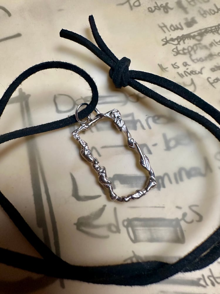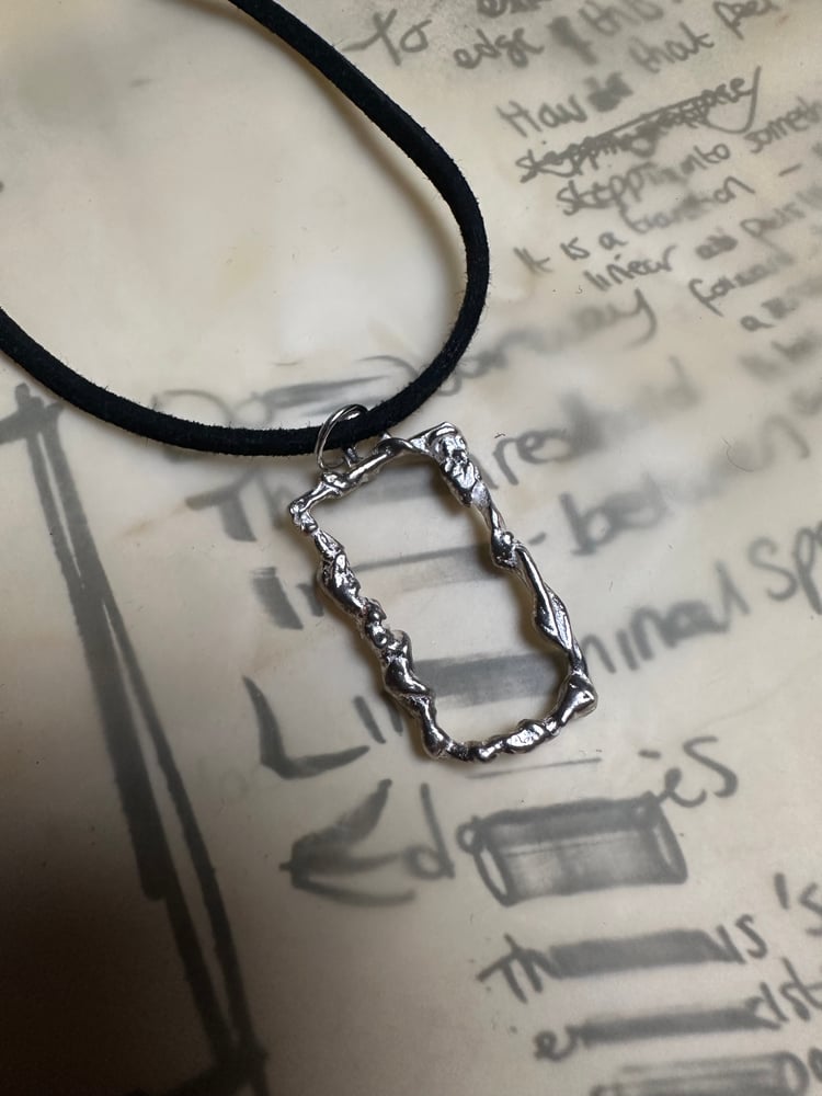 Molten silver pendant echoing the shape of a doorway. It speaks to thresholds, portals, and liminal spaces. A symbol of transition, the possibilities beyond and the in-between places we inhabit.