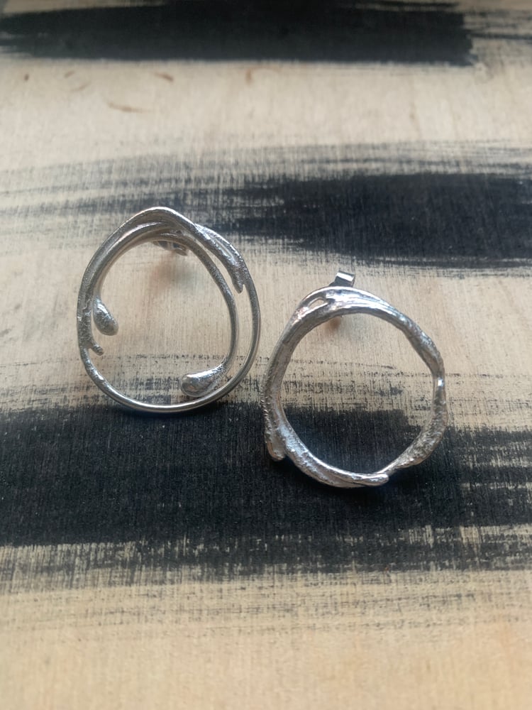 Molten silver earrings made by melting circles of silver wire until they fuse together.