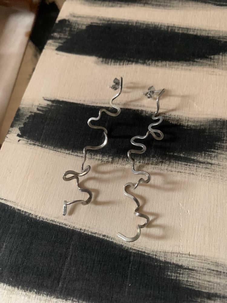Wiggly drop earrings made from hammered and shaped recycled silver.